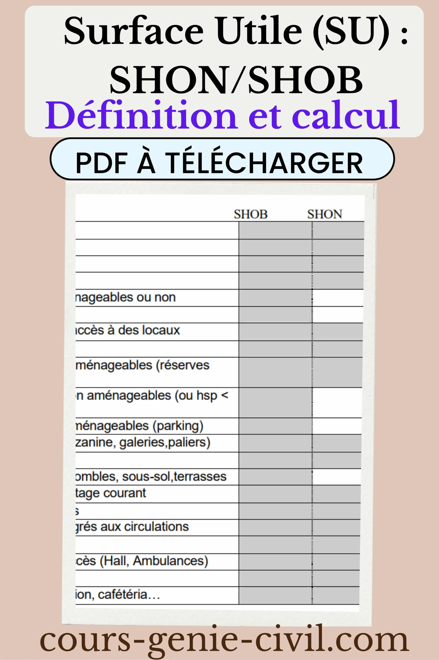 <p>Découvrez comment calculer et comprendre la Surface Utile et ses différences avec la SHON et la SHOB. Guide complet à télécharger.</p><p>Êtes-vous en train de planifier un projet immobilier et vous demandez comment calculer précisément la surface de votre bâtiment ? Ou peut-être souhaitez-vous comprendre la différence entre la Surface Utile (SU), la Surface Hors Œuvre Nette (SHON) et la Surface Hors Œuvre Brute (SHOB) ?</p><p>Ces notions sont essentielles pour réussir votre projet, que ce soit pour une construction résidentielle, commerciale ou hospitalière. La Surface Utile (SU) est une donnée clé pour déterminer la capacité réelle d’un espace, son coût, et sa conformité aux réglementations d’urbanisme. Pourtant, leur calcul et leurs différences restent souvent flous pour les non-initiés.</p><p>Dans cet article, nous vous expliquons en détail comment calculer la Surface Utile, sa définition précise, et comment elle se différencie des autres surfaces comme la SHON et la SHOB. Vous découvrirez aussi l’importance de ces notions dans la planification, le financement, et la conformité juridique de vos projets immobiliers. Téléchargez notre guide complet en version Word pour approfondir tous ces points et mieux maîtriser la gestion de vos surfaces.</p><p><img class="Illustration-bâtiment-3D-zones-colorées-indiquant-différentes-surfaces-SU-SHON-SHOB alignnone wp-image-9499 size-large" title="Illustration d’un bâtiment en 3D avec zones colorées indiquant différentes surfaces : SU, SHON, SHOB, pour montrer leurs différences." src="https://cours-genie-civil.com/wp-content/uploads/2025/10/Surface-Utile-SU-Calcul-Definition-et-Differences-SHONSHOB-683x1024.webp" alt="Image représentant un plan architectural avec superficie en mètres carrés indiquée, illustrant la distinction entre surface utile, SHON et SHOB." width="683" height="1024" /></p><hr /><h2>Les bases d&rsquo;une compréhension claire des surfaces en construction</h2><h3>Qu&rsquo;est-ce que la Surface Utile (SU) ?</h3><p>La Surface Utile (SU) désigne la surface intérieure d’un bâtiment utilisée réellement pour l’activité ou l’habitation. Elle exclut généralement les espaces de circulation, les locaux techniques, ou tout autre espace non directement exploitable. La SU est conçue pour donner une idée simple de la consommation d’espace utile pour l’utilisation finale, une information cruciale pour l’estimation financière et la conformité réglementaire.</p><p><strong>Exemple:</strong> Dans une clinique hospitalière, la SU inclut les salles d’examen, les chambres de patients, mais exclut les couloirs, certains locaux techniques, ou espaces de stockage.</p><h3>Comment calcule-t-on la Surface Utile ?</h3><p>Le calcul de la Surface Utile se base sur la surface intérieure des locaux, en excluant :</p><ul><li>Circulations horizontales (couloirs, halls d’entrée, paliers)</li><li>Circulations verticales (escaliers, ascenseurs)</li><li>Locaux techniques ou de stockage</li><li>Espaces non aménageables ou sous-utilisés</li></ul><p>Une règle simple consiste à prendre la surface au sol de chaque pièce ou espace, puis à enlever ces zones non exploitées, pour obtenir la SU précise.</p><h3>La différence entre SU et surface habitable</h3><p>Contrairement à la surface habitable, qui est souvent une notion réglementaire spécifique à l’immobilier résidentiel, la Surface Utile se concentre sur l’usage pratique des espaces. La surface habitable inclut souvent des espaces de circulation et peut varier selon les normes locales ou nationales.</p><hr /><h2>Comprendre la SHON, la SHOB et la SUBL : définitions et applications</h2><h3>Qu&rsquo;est-ce que la SHON ?</h3><p>La Surface Hors Œuvre Nette (SHON) représente la surface de plancher construite, hors les surfaces non aménageables telles que les murs, les locaux techniques ou aisément accessibles. Elle sert principalement à évaluer la conformité d’un projet aux règles d’urbanisme et à calculer la densité de construction.</p><p><strong>Différence clé avec la SU :</strong> La SHON inclut la surface brute de chaque niveau, sans distinguer si elle est utilisable ou non pour l’usage prévu.</p><h3>La SHOB, une mesure plus large</h3><p>La Surface Hors Œuvre Brute (SHOB) inclut la totalité de la surface hors œuvre au sol, y compris les surfaces extérieures telles que balcons, loggias ou terrasses, et même certains annexes. Elle sert surtout pour évaluer la grandeur totale d’un bâtiment en phase de conception ou de permis.</p><h3>La SUBL : une sous-catégorie spécifique</h3><p>La Surface Utile dans l’œuvre (SUBL) est une notion spécifique souvent utilisée pour les projets hospitaliers ou de grandes infrastructures. Elle est une extrapolation de la SU, ajustée en fonction de coefficients sectoriels pour prendre en compte la complexité technique et fonctionnelle du bâtiment.</p><h2>Télécharger le PDF complet sur la surface utile, SHON, la SHOB et la SUBL.</h2><p>Maîtrisez la Surface Utile (SU): définition, calcul, différences avec SHON/SHOB. Optimisez vos projets immobiliers avec notre guide expert.</p><p><span style="font-size: 2em;"><b>ððð<a href="https://cours-genie-civil.com/wp-content/uploads/2025/10/74495820-Surface-Shob-Shon-Sdo-Su.pdf" data-original-attrs="{";data-original-href";:";https://drive.google.com/uc?export=download&;id=1WiIfYekY0sHcJguEZQy0KvnPkSlx8HCA";,";target";:";_blank";}">[ð Télécharger le <em>pdf</em>]</a></b> </span></p><hr /><h2>Pourquoi la différence entre ces surfaces est-elle essentielle ?</h2><p>Comprendre ces distinctions permet d’éviter des erreurs lors de la conception, de la budgétisation et de la conformité réglementaire. Par exemple :</p><ul><li>La SHON sert à respecter les règles d’urbanisme.</li><li>La SHOB donne une vue d’ensemble du volume total du bâtiment.</li><li>La SU, quant à elle, permet d’évaluer la capacité 