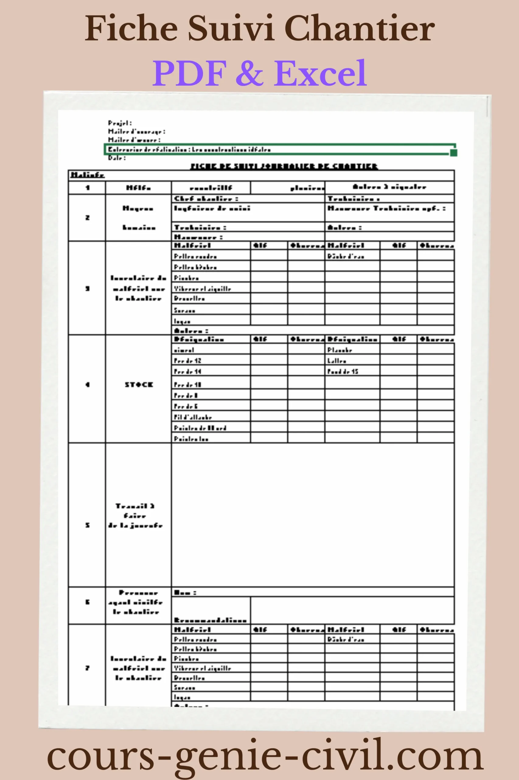 <p class="ds-markdown-paragraph">Vous gérez un chantier et vous perdez le fil des tâches, des stocks ou des équipes ? Imaginez un outil qui centralise toutes ces informations en un seul endroit, accessible et facile à utiliser. Ce modèle de fiche de suivi de chantier, disponible gratuitement en PDF et Excel, est conçu pour vous faire gagner du temps et de l’énergie. Dans cet article, nous vous présentons un outil complet pour optimiser la gestion de vos projets de construction, que vous soyez chef de chantier, artisan ou auto-constructeur.</p><p><img class="Modèle de fiche de suivi chantier journalier avec tableau de bord clair pour professionnels du bâtiment. alignnone wp-image-9221 size-large" title="Modèle de fiche de suivi chantier journalier avec tableau de bord clair pour professionnels du bâtiment." src="https://cours-genie-civil.com/wp-content/uploads/2025/09/Modele-de-Fiche-de-Suivi-Chantier-PDF-Gratuit-Excel-Inclus-2-683x1024.webp" alt="Capture d’écran d’un modèle de fiche de suivi de chantier professionnel, montrant les sections météo, inventaire matériel et stocks." width="683" height="1024" /></p><h2>Les bases d’une fiche de suivi de chantier efficace</h2><p class="ds-markdown-paragraph">Une fiche de suivi de chantier est bien plus qu’un simple formulaire. C’est le journal de bord de votre projet. Elle permet de noter quotidiennement les avancées, les ressources utilisées et les éventuels problèmes. Pourquoi est-ce indispensable ? Parce qu’elle offre une traçabilité précise et facilite la communication entre tous les acteurs du projet.</p><h3>L’importance du suivi quotidien</h3><p class="ds-markdown-paragraph">Sans un suivi rigoureux, il est facile de perdre le contrôle des délais, des coûts et de la qualité des travaux. Un tableau de suivi de chantier vous aide à :</p><ul><li><p class="ds-markdown-paragraph">Anticiper les besoins en matériaux et en main-d’œuvre.</p></li><li><p class="ds-markdown-paragraph">Identifier rapidement les retards ou les anomalies.</p></li><li><p class="ds-markdown-paragraph">Justifier l’avancement des travaux auprès des clients ou des financeurs.</p></li></ul><p class="ds-markdown-paragraph">Avec un modèle standardisé, vous gagnez en efficacité et en professionnalisme.</p><h2>Comment utiliser notre modèle de fiche de suivi chantier ?</h2><p class="ds-markdown-paragraph">Notre modèle de fiche de suivi de chantier PDF et Excel est conçu pour être intuitif et adaptable à tous types de projets, du bâtiment à la rénovation. Voici comment en tirer le meilleur parti.</p><h3>Sections clés à remplir</h3><p class="ds-markdown-paragraph">La fiche comprend plusieurs parties essentielles :</p><ul><li><p class="ds-markdown-paragraph"><strong>Météo et équipe</strong> : Notez les conditions climatiques et les présents sur le chantier.</p></li><li><p class="ds-markdown-paragraph"><strong>Inventaire du matériel</strong> : Listez les outils et équipements disponibles.</p></li><li><p class="ds-markdown-paragraph"><strong>Stock des matériaux</strong> : Suivez les quantités de ciment, fer, etc.</p></li><li><p class="ds-markdown-paragraph"><strong>Travaux prévus et réalisés</strong> : Comparez les objectifs avec la réalité.</p></li><li><p class="ds-markdown-paragraph"><strong>Observations et besoins</strong> : Signalez les problèmes ou commandes à passer.</p></li></ul><p class="ds-markdown-paragraph">Remplir cette fiche ne prend que quelques minutes chaque jour, mais cela vous évite bien des soucis à long terme.</p><h3>Exemple concret d’utilisation</h3><p class="ds-markdown-paragraph">Prenons l’exemple d’un chantier de maçonnerie. Le matin, vous notez les conditions météo, le nombre d’ouvriers et l’état des stocks. En fin de journée, vous reportez les travaux effectués, les restes de matériaux et les éventuels imprévus. Cette routine simple vous permet de ajuster rapidement vos planning et budgets.</p><h2>Pourquoi choisir un modèle Excel pour le suivi de chantier ?</h2><p class="ds-markdown-paragraph">Un fichier Excel suivi travaux maison offre une flexibilité incomparable. Vous pouvez personnaliser les colonnes, ajouter des formules de calcul ou générer des graphiques pour visualiser l’avancement.</p><h3>Avantages du format Excel</h3><ul><li><p class="ds-markdown-paragraph"><strong>Calculs automatiques</strong> : Estimez les dépenses ou les quantités restantes.</p></li><li><p class="ds-markdown-paragraph"><strong>Historique modifiable</strong> : Corrigez ou complétez les données à tout moment.</p></li><li><p class="ds-markdown-paragraph"><strong>Export facile</strong> : Transformez vos données en PDF pour les partager.</p></li></ul><p class="ds-markdown-paragraph">Notre modèle de feuille de suivi de chantier inclut déjà ces fonctionnalités, prêtes à l’emploi.</p><h2>Téléchargez gratuitement votre fiche de suivi</h2><p class="ds-markdown-paragraph">Nous mettons à votre disposition ce modèle de fiche de suivi de chantier bâtiment Excel et PDF, entièrement gratuit. Il est idéal pour les professionnels comme les particuliers engagés dans des travaux de construction ou de rénovation.</p><h3>Comment procéder au téléchargement ?</h3><p class="ds-markdown-paragraph">Pour recevoir votre exemplaire, il vous suffit de cliquer sur les liens ci-dessous :</p><p><span style="font-size: 2em;"><b>ððð<a href="https://cours-genie-civil.com/wp-content/uploads/2025/09/519362272-fiche-de-suivi-SMART-NDE.pdf" data-original-attrs="{";data-original-href";:";https://drive.google.com/uc?export=download&;id=1WiIfYekY0sHcJguEZQy0KvnPkSlx8HCA";,";target";:";_blank";}">[ð Télécharger le <em>pdf</em>]</a></b></span></p><p><span style="font-size: 2em;"><b>ððð<a href="https://cours-genie-civil.com/wp-content/uploads/2025/09/519362272-fiche-de-suivi-SMART-NDE.xlsx" data-original-attrs="{";data-original-href";:";https://drive.google.com/uc?export=download&;id=1WiIf