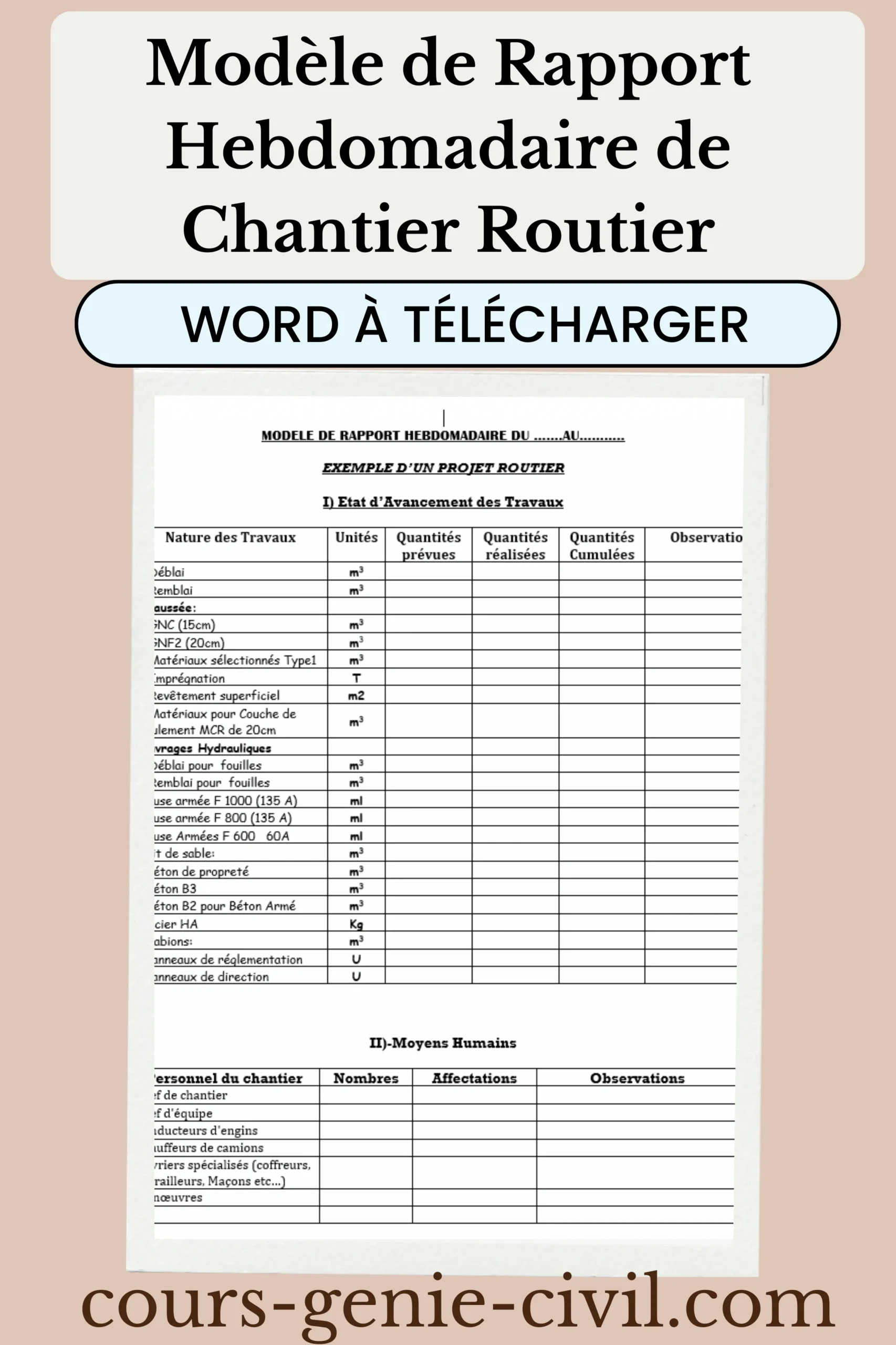 <p>Modèle de rapport hebdomadaire de chantier Word : suivez déblais, remblais et chaussées. Téléchargez maintenant pour gérer vos projets !</p><p><img class="Modèle_rapport_hebdomadaire_chantier_routier alignnone wp-image-9652 size-large" title="Modèle de rapport hebdomadaire de chantier routier affiché sur un ordinateur portable, avec des données de travaux routiers." src="https://cours-genie-civil.com/wp-content/uploads/2025/10/Modele-de-Rapport-Hebdomadaire-de-Chantier-Routier-Word-683x1024.webp" alt="Modèle de rapport hebdomadaire de chantier routier affiché sur un ordinateur portable, avec des données de travaux routiers." width="683" height="1024" /></p><p dir="auto">Avez-vous déjà été dépassé par la gestion d’un chantier routier ? Entre les déblais, les remblais, les ouvrages hydrauliques et la coordination des équipes, tenir un suivi précis peut vite devenir un casse-tête. C’est là qu’intervient un <strong>modèle de rapport hebdomadaire de chantier routier &#8211; Word</strong>, un outil indispensable pour structurer vos données et garder une vue d’ensemble. Ce document téléchargeable permet aux chefs de chantier, ingénieurs et gestionnaires de projets de suivre l’avancement des travaux, d’évaluer les ressources humaines et matérielles, et d’identifier les points à améliorer. Dans cet article, nous allons explorer pourquoi ce modèle est essentiel, comment l’utiliser efficacement, et comment il peut transformer la gestion de vos projets routiers. Prêt à optimiser votre suivi de chantier ? Téléchargez notre modèle en Word et découvrez des astuces pratiques pour booster votre productivité !</p><hr /><h2 dir="auto">Pourquoi un Rapport Hebdomadaire est Crucial pour les Projets Routiers</h2><h3 dir="auto">L’Importance d’un Suivi Structuré</h3><p dir="auto">Un chantier routier, qu’il s’agisse de la construction d’une autoroute ou de la réhabilitation d’une route locale, implique des tâches complexes : déblais, remblais, pose de chaussées, installation de buses armées, etc. Sans un suivi régulier, il est facile de perdre de vue l’avancement des travaux ou de manquer des problèmes critiques. Un <strong>rapport hebdomadaire de chantier Word</strong> offre une structure claire pour consigner toutes ces informations, facilitant la communication avec les équipes et les parties prenantes.</p><ul dir="auto"><li><strong>Centralisation des données</strong> : Regroupez les quantités prévues, réalisées et cumulées en un seul document.</li><li><strong>Gain de temps</strong> : Un modèle prêt à l’emploi évite de créer un rapport de zéro chaque semaine.</li><li><strong>Transparence</strong> : Partagez des informations claires avec la maîtrise d’œuvre et le maître d’ouvrage.</li></ul><h3 dir="auto">Comment ce Modèle Améliore la Gestion de Projet</h3><p dir="auto">Un bon rapport hebdomadaire ne se contente pas de lister des chiffres. Il permet d’analyser les performances, d’identifier les retards et de proposer des solutions. Par exemple, si les quantités réalisées pour les matériaux de chaussée (comme le GNC ou le GNF2) sont en retard, vous pouvez ajuster les ressources ou planifier des actions correctives. Notre <strong>exemple de rapport hebdomadaire de chantier</strong> en Word est conçu pour répondre à ces besoins, avec des sections dédiées aux observations et recommandations.</p><hr /><h2 dir="auto">Les Composantes Clés d’un Rapport Hebdomadaire de Chantier</h2><h3 dir="auto">État d’Avancement des Travaux</h3><p dir="auto">La première section d’un <strong>modèle de rapport hebdomadaire de chantier routier &#8211; Word</strong> concerne l’avancement des travaux. Cette partie recense les tâches effectuées, comme :</p><ul dir="auto"><li><strong>Déblais et remblais</strong> : Mesurés en m³, ils permettent de suivre les terrassements.</li><li><strong>Chaussée</strong> : Inclut des matériaux comme le GNC (15 cm), le GNF2 (20 cm) ou la couche de roulement MCR.</li><li><strong>Ouvrages hydrauliques</strong> : Suivi des buses armées (F 1000, F 800, F 600), du béton, ou des gabions.</li><li><strong>Signalisation</strong> : Installation de panneaux de réglementation et de direction.</li></ul><p dir="auto">Chaque tâche est accompagnée des quantités prévues, réalisées et cumulées, avec une colonne pour les observations. Cela permet de repérer immédiatement tout écart et d’agir en conséquence.</p><h3 dir="auto">Moyens Humains et Matériels</h3><p dir="auto">Un chantier ne fonctionne pas sans une équipe et des équipements adaptés. Le modèle inclut des sections pour :</p><ul dir="auto"><li><strong>Personnel</strong> : Chef de chantier, conducteurs d’engins, ouvriers spécialisés (coffreurs, maçons, etc.).</li><li><strong>Matériel</strong> : Niveleuses, compacteurs, pelles hydrauliques, camions, etc., avec leur état (en activité ou en panne).</li></ul><p dir="auto">Ces informations aident à évaluer si les ressources sont suffisantes ou si des ajustements sont nécessaires.</p><h3 dir="auto">Commentaires et Faits Marquants</h3><p dir="auto">Cette section permet de noter les événements importants de la semaine, comme des intempéries, des retards de livraison, ou des incidents de sécurité. Par exemple, un compacteur en panne peut ralentir la pose de la chaussée, et cela doit être documenté pour ajuster le planning.</p><hr /><h2 dir="auto">Comment Utiliser le Modèle de Rapport Hebdomadaire de Chantier Word</h2><h3 dir="auto">Étape 1 : Téléchargez et Personnalisez le Modèle</h3><p dir="auto">Notre <strong>modèle de rapport hebdomadaire de chantier Word</strong> est téléchargeable directement et prêt à l’emploi. Une fois téléchargé, ouvrez-le dans Microsoft Word et personnalisez-le avec :</p><ul dir="auto"><li>Les dates de la semaine concernée.</li><li>Les informations spécifiques à votre projet (nom, localisation, etc.).</li><li>Les